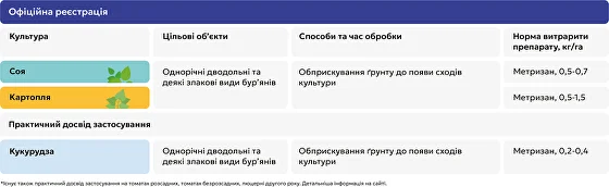 ⚠ Внимание! Некоторые сорта сои и картофеля могут иметь индивидуальную чувствительность к метрибузину. При неблагоприятных условиях возможны симптомы фитотоксичности (временное пожелтение, замедление роста) .